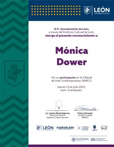 Mónica Dower es una artista multidisciplinaria (Southampton Gran Bretaña, 1966) naturalizada mexicana. Su propuesta incluye dibujo, pintura, performance y video. Su obra se caracteriza por la creación de espacios ilusorios a través del agua, así como el uso de imagen y el movimiento que crean imaginarios heterogéneos. Mónica estudió Artes Visuales en la FAD, (UNAM). Realizó una residencia en París de tres años (1989-1992) trabajando arte oriental, pintura y acuarela en el atelier del Maestro Luis Ansa. Ha realizado 14 exposiciones individuales y ha participado en más de 60 exposiciones colectivas en México y en otros países como Alemania, Argentina, Canadá, China, Croacia, Cuba, España, EUA, Francia, Italia, Portugal y Suiza. Becaria por el Sistema Nacional de Creadores de Arte, (2010-2013) y recipiente del premio de producción de CONACULTA (UPX) para su video instalación, la sopa una historia privada, (2003), premiada por David Ross, Pedro Meyer y Ana de la Rosa, su video instalación fue exhibida en San Ildefonso dentro del marco de la exposición Zona ilimitada . La soupe. A private Story, elegido para mostrarse en el Festival International du Film sur L´ art, 27 FIFA, Montréal, 9-19 mars 2009. Desde 2012 forma parte de FEM LINK, una red Internacional de mujeres video artistas (http://www.femlink.org/). Seleccionada por la artista y curadora Marta Palau en la V Bienal Internacional de Estandartes, Tijuana, México, 2006. En 2004 obtiene una Mención Honorífica en la XII Bienal Rufino Tamayo, con el Jurado: Raquel Tibol, Teresa Del Conde, Itala Schmeltz y Alma Ruíz Furlán. En 1998 realiza «The Origins», Mural de 30 pies para el Hospital Bellevue de Nueva York, auspiciado por el Museum for the African Art y por el Mexican Cultural Institute of New York. En 1994 obtiene la Beca de Jóvenes Creadores del FONCA. Desde 2014 es docente de la materia de Bidimensión en La Esmeralda. Su exposición individual más reciente, Mujeres entretejidas, con textos de Dina Comisarenco y Miriam Kaiser, 2025, Guerreras en el Tiempo, en el Instituto de Cultura de México en España, curada por Mónica Sotos ( Abril 2022) y en (2016) el Laboratorio de Arte Alameda, dónde expone su proyecto The Swimming pool series curada por Agnès Mérat del Instituto de Crítica 17. Su exposición internacional más reciente, en julio 2022: La Iberoamericana de Toro, Mujer y Artes Visuales, Siglo XXI, en Castilla y León, España, curada por Víctor Del Campo del . En el 2019 participa en la exposición internacional Temporary Garden/Tiger Lily and Agave, en el Snarte Space, Nan Chang City, Jiang Xi Province en China, curada por Chai Mi y Elizabeth Ross. Pintando la imagen-movimiento, en la Galería Ginocchio en 2011; Entre Invasiones y mujeres flotantes, Galería y Centro de Investigación Artística de Arte Contemporáneo, Frontground – Manolo Rivero, Mérida, 2009; Quién me habita obras y dibujos de gran formato en el Museo del Chopo en el 2004; La vie en rose, en la Galería Nina Menocal, México DF, 2001; La espera, Galería Praxis. México DF, 2002. Sobresalen en Francia dos individuales: Nalaumana, en París, en la Galerie Artco, 1994, y Les Imaginaires, en la Galerie Taylor de Pau, 1992. La Ciudad de México en el arte, Travesía ocho siglos, en el Museo de la Ciudad de México, (2017-2018); Portas Abertas en el 2013 en Évora Portugal; Materia sensible, en el Museo Carrillo Gil (curaduría Caroline Montenat); Buscar lo real (curaduría Silvia Navarrete) en el Museo de San Carlos, en 2012; 20 Años FONCA. 1989/ 2009; Magna Exposición Retrospectiva. Selección de 150 Jóvenes Creadores. Biblioteca Vasconcelos, 2009; Algunas de sus exposiciones internacionales: Imágenes multimedia de un mundo complejo. Visiones desde ambos lados del Atlántico, exposición itinerante: Curaduría Jesús Rubio La Paz, Julia Portela y Julio Flores, Centro Cultural Recoleta, Buenos Aires; Hospital Real, Granada, España; Instituto Ludwig, La Habana; Centro Multimedia del CNA, México DF; Sala Santa Inés de Sevilla, España, 2008. Come Closer, Aktuelle Videoarbeiten aus México, curator, Paola Santoscoy, Kunstlerhaus Bethanien, Berlín 2005. September Back-up, curator, Paola Santoscoy, Isola Art Center, Milán, 2005. Deriva mental. Panorámica. Museo Tamayo Arte Contemporáneo, México DF. Curadora Tatiana Cuevas, 2004.