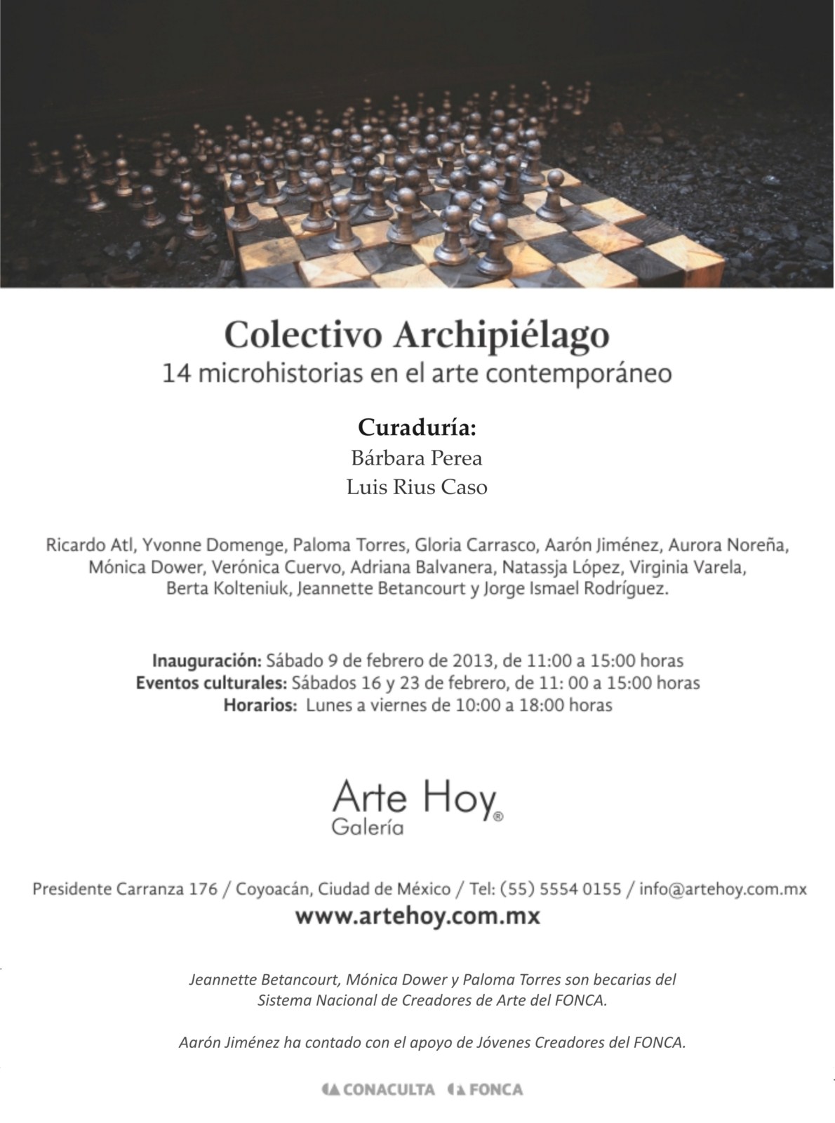 Archipiélago. 14 microhistorias en el arte contemporáneo, curaduría Bárbara Perea y Luis Rius Caso, Galería Arte Hoy, 2013.