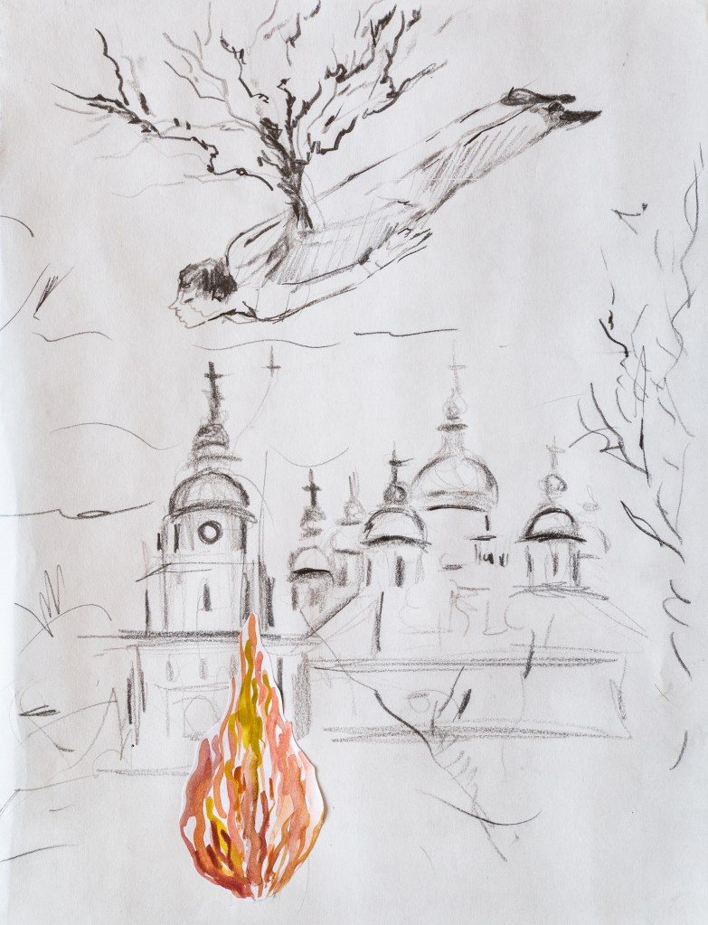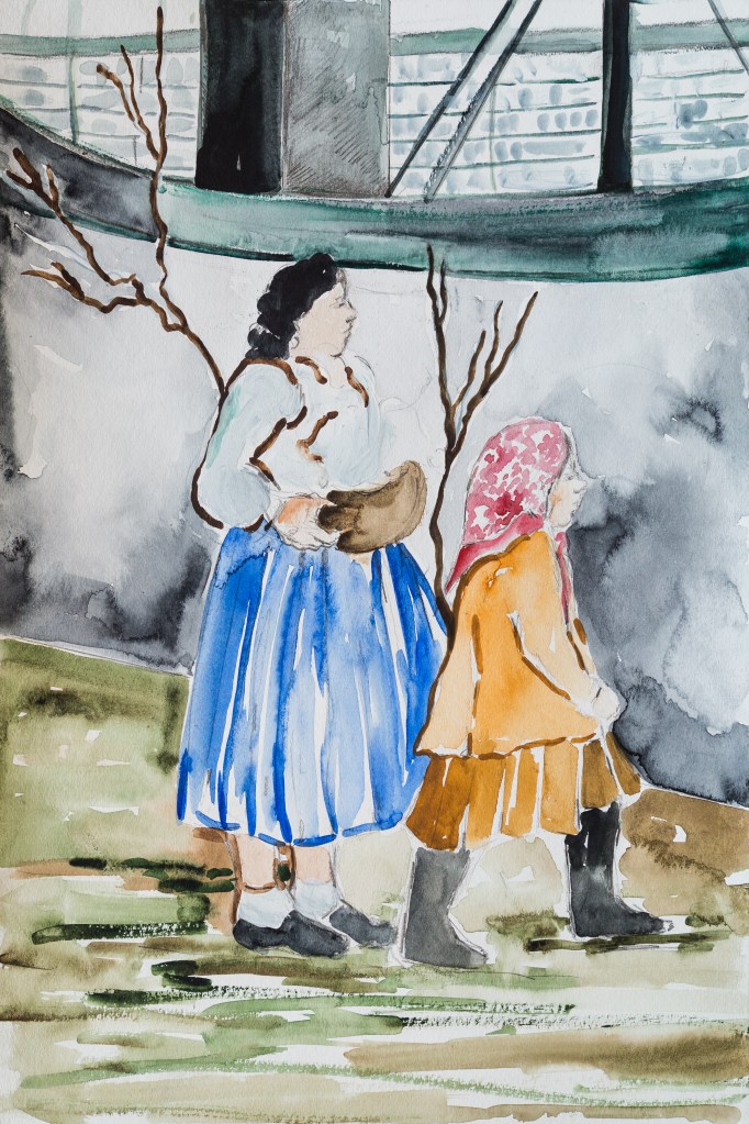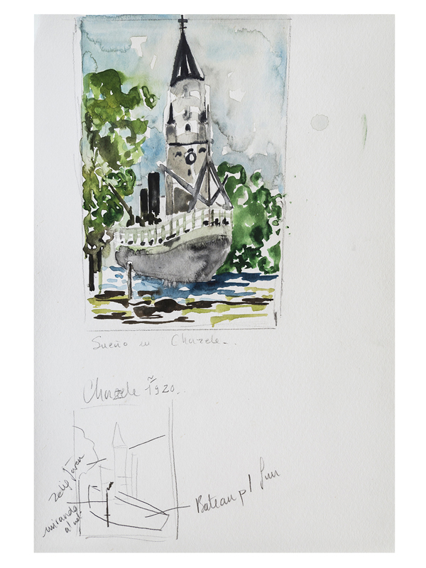 Pequeño boceto, Sueño en Chorzele, pueblo natal de mi abuelo, acuarela y grafito sobre papel, 46 x 30 cm, 2019.