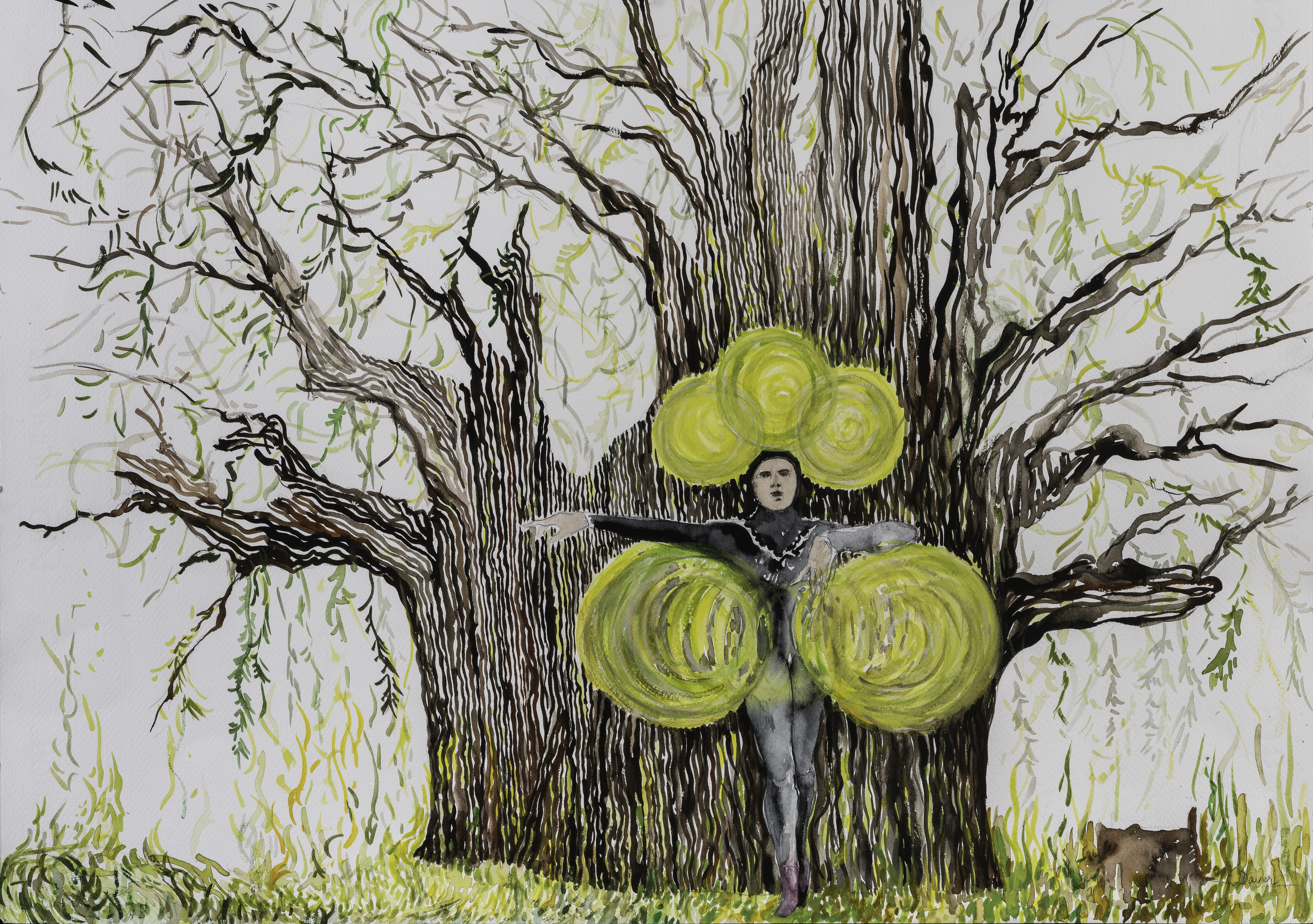 El abuelo cayendo sobre cerro mazateco con sus alas/raíces (Y a la vez cómo estás ramas están en el lugar exacto de unas posibles alas, les sirven también como eso, como alas para desplazarse y viajar a donde quieran), acuarela sobre papel, 30 x46 cm, 2019.