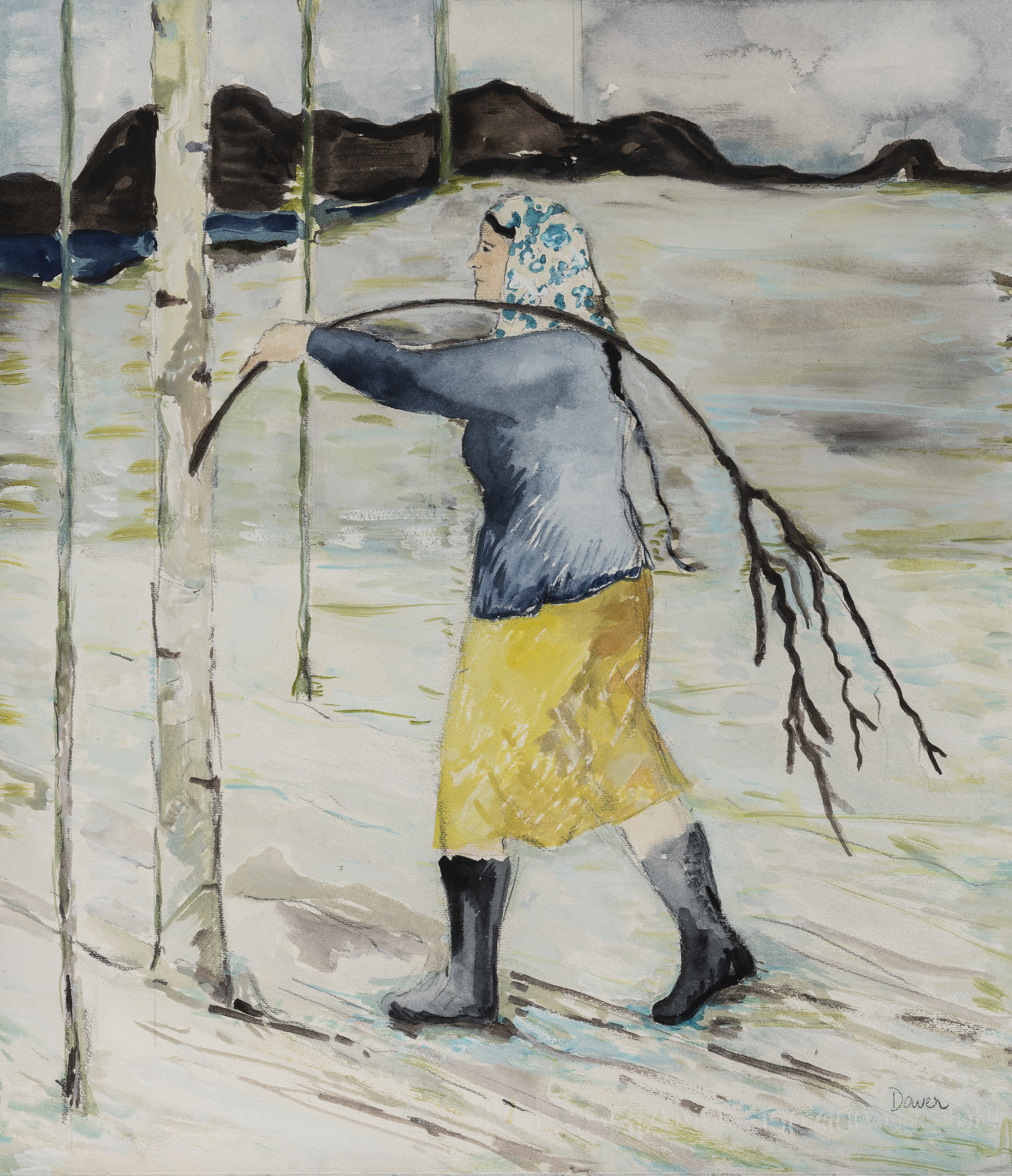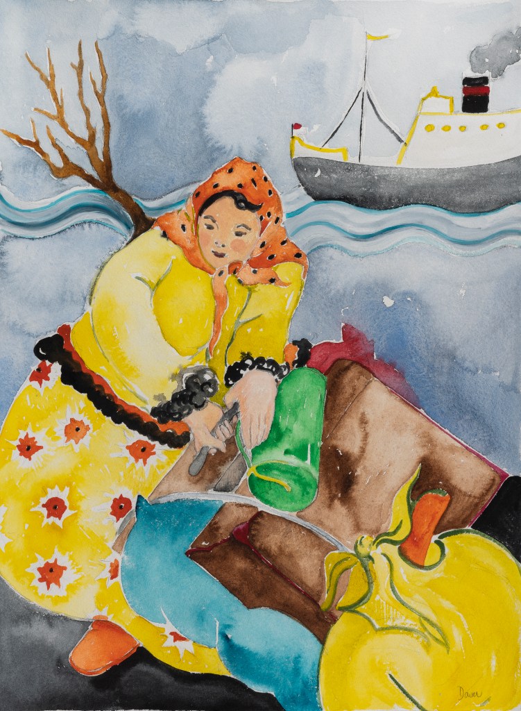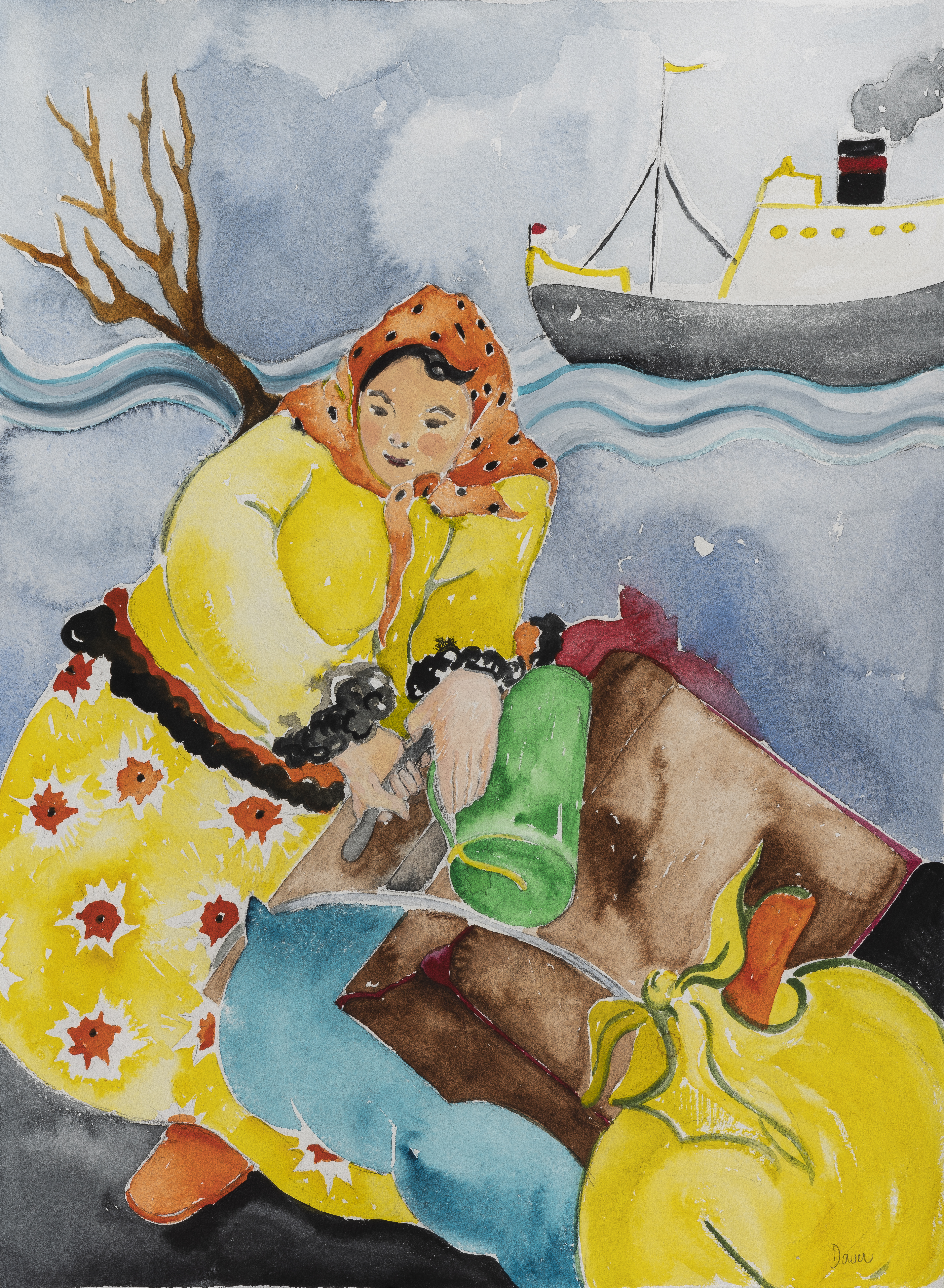 Migrante llevando sus alas/raíces, acuarela sobre papel, 60 x45 cm.